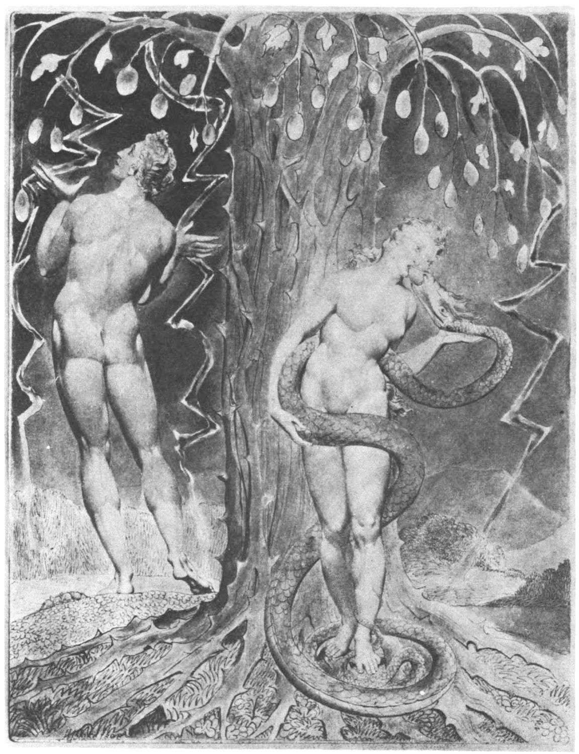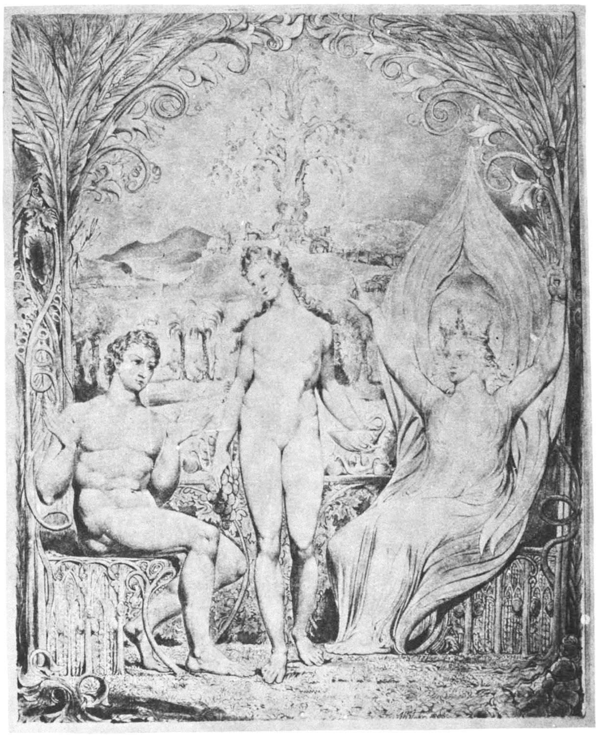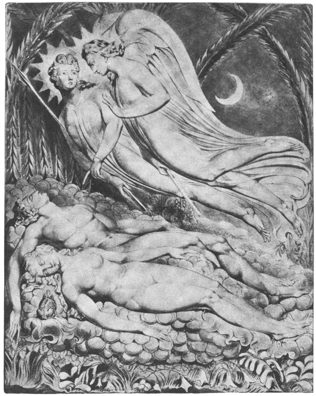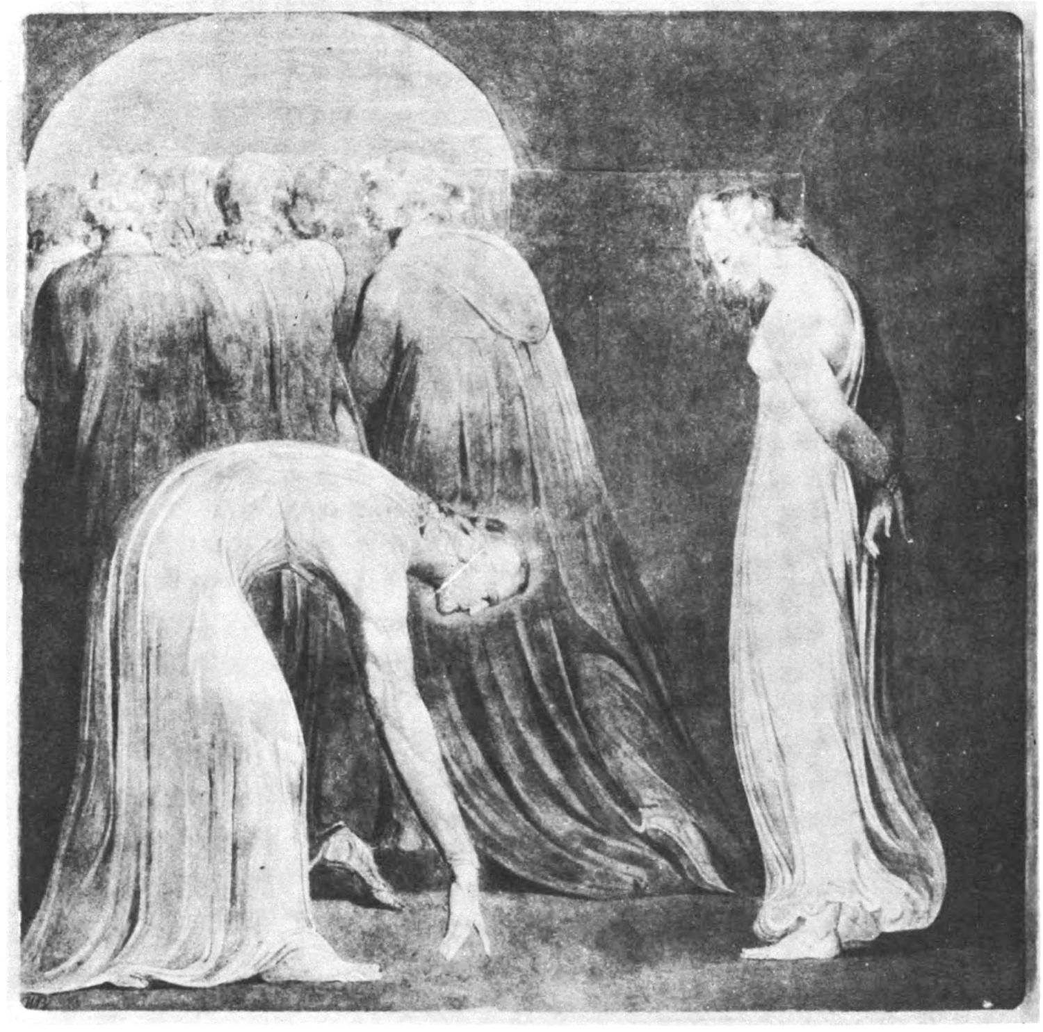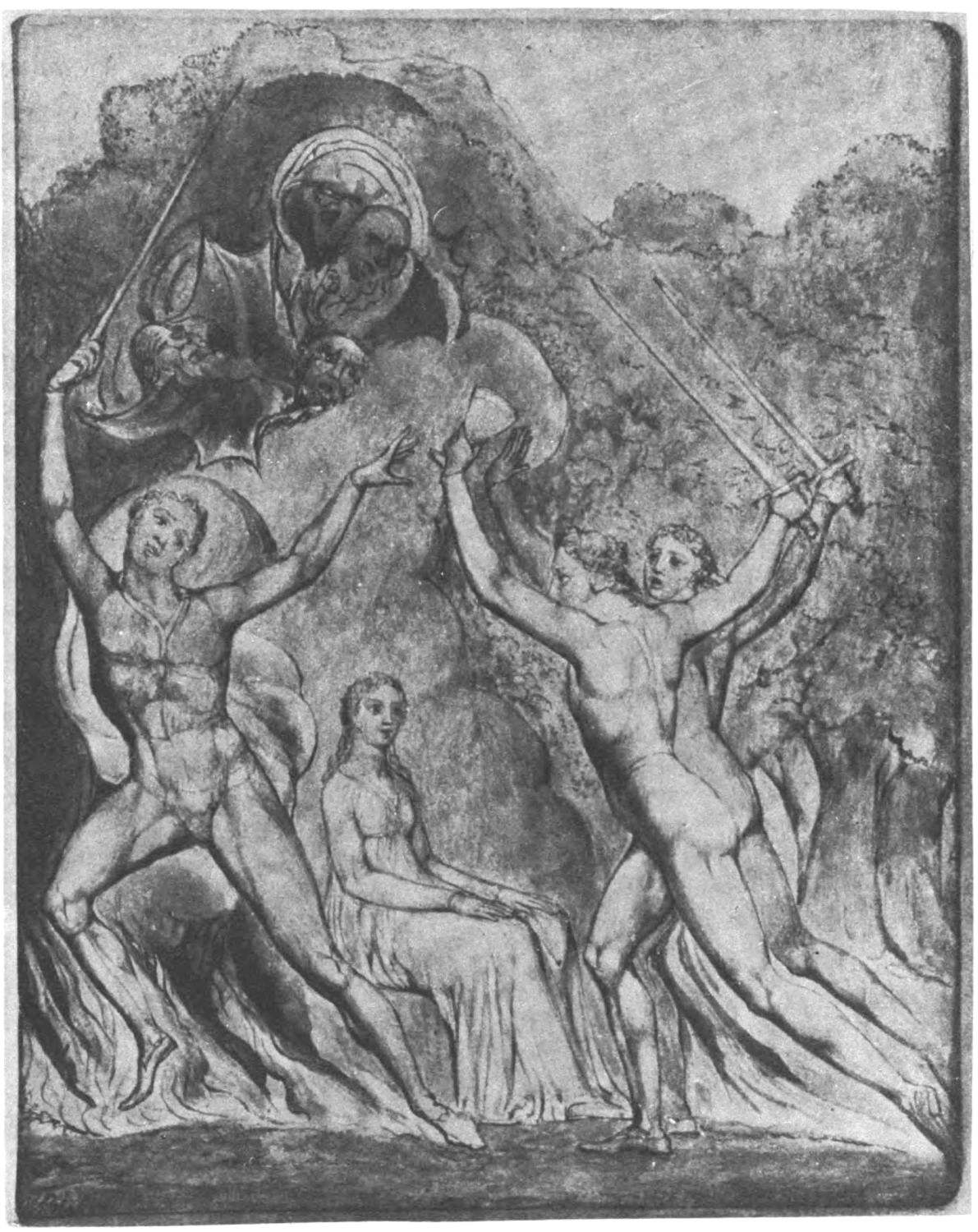 William Blake was born in London in 1757, and in 1827 he departed for “that undiscovered country” which all his life he had wished to see. Throughout the century which has passed since Blake’s death, much has been written about him. During the past few years a goodly number of our greatest men of letters have issued books on his life, art, and writings. Many of his writings have gone through several editions, but it was only within the past year that his complete works were issued, and that in a limited edition, which was soon off the market. While from time to time volumes of reproductions of a part of Blake’s masterly engravings and drawings have been issued, a large portion of his finest creations, including the “Paradise Lost” series, has not been accessible in reproductions.